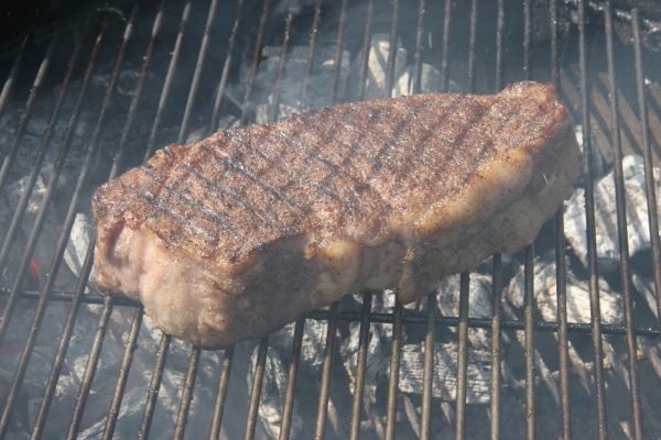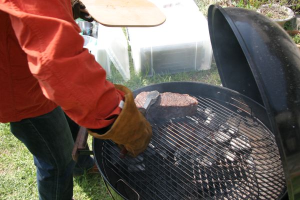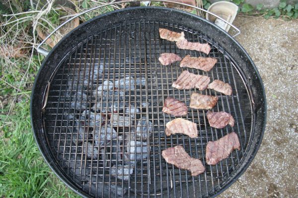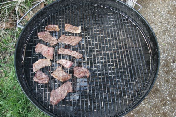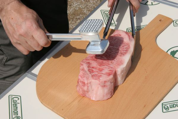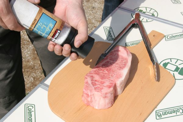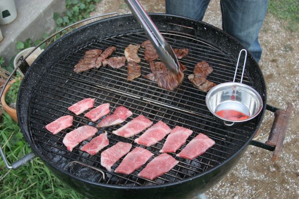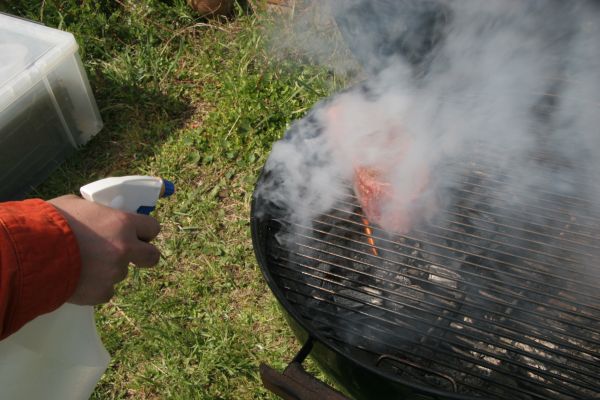 焼くときは、炭火をスリーゾーン・スロープド・ファイヤーでセットし、まず強火で肉の表面を焼き固め、肉汁を閉じ込めます。このときに焼き目をつけるのも美味しく見せるウラ技です。また脂が燃えて炎が出たら、スス臭くなりますので、水鉄砲などで炭に水をかけて消火してください。少々の水では炭火の火力は落ちませんので安心して消してください。炭火の遠赤外線で焼くことを思い出してください。