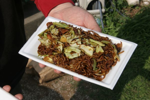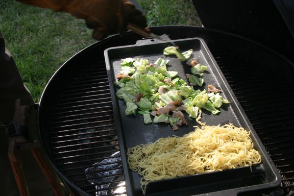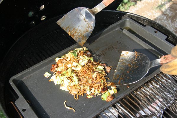 美味しい焼きそばを焼くには、強い火力が必要です。鉄板を良く焼いた状態で、麺と具は別々に炒めます。